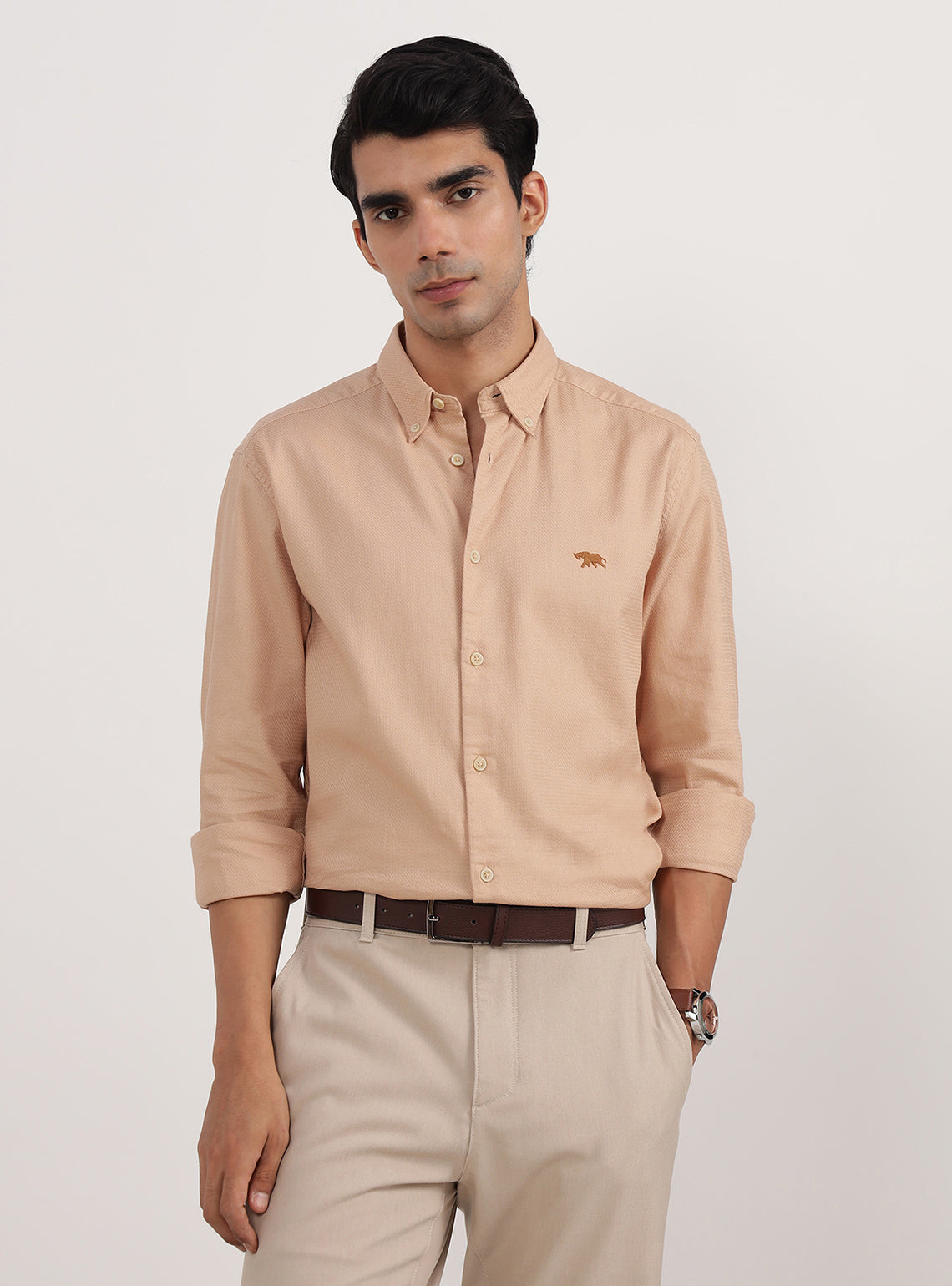 This shirt is meticulously crafted from cotton in a dobby weave, ensuring comfort and breathability. Designed in a full-sleeve silhouette, it not only provides sophistication but also features a button-down collar, & Rajan, the mark of Andamen.