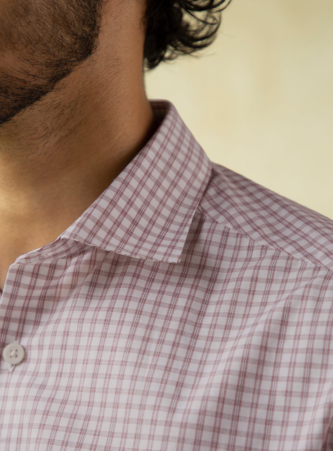 Presenting a formal shirt in a gorgeous red color. Made entirely from a rich Indian cotton with enhanced stretch. The goodness of the silhouette combined with the craftmanship, truly makes it a timeless style. Built in a mid-weight fabric, this shirt features a small point semi cutaway collar & insignia embroidery on cuffs.