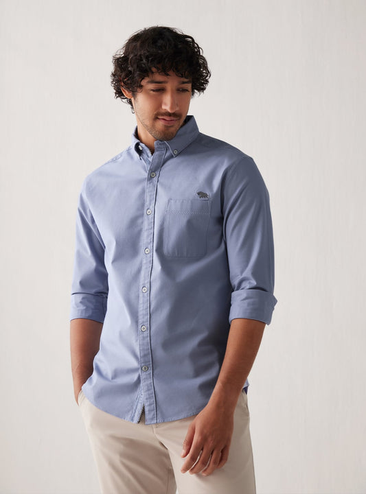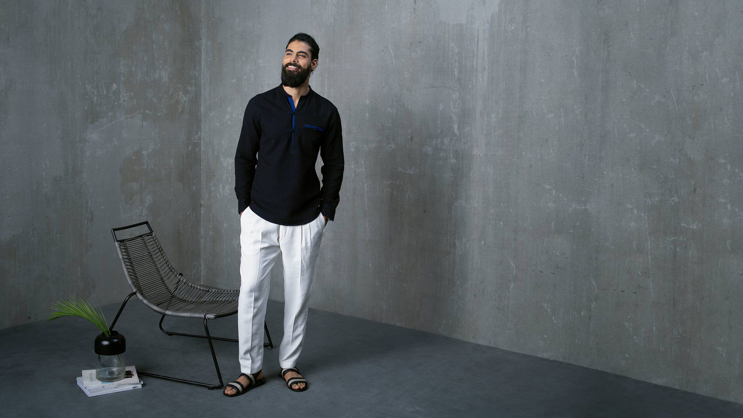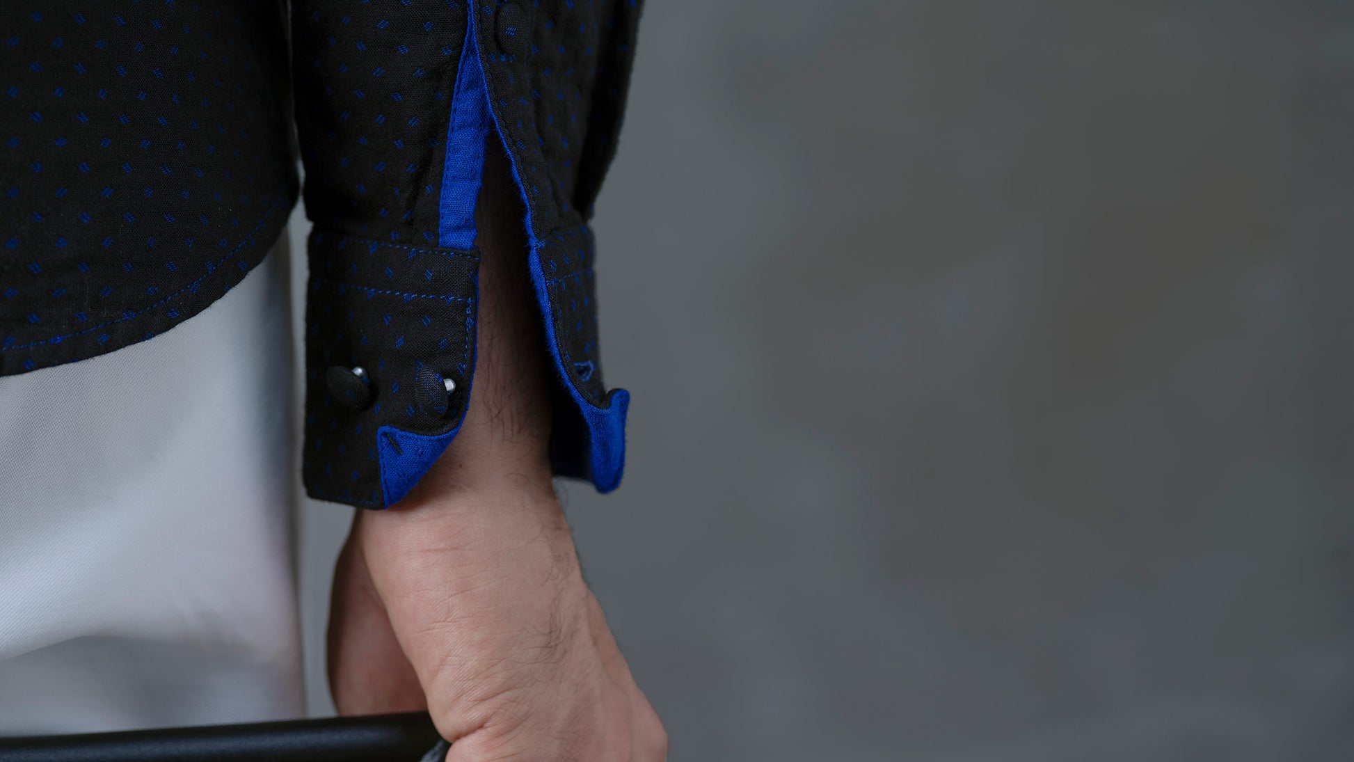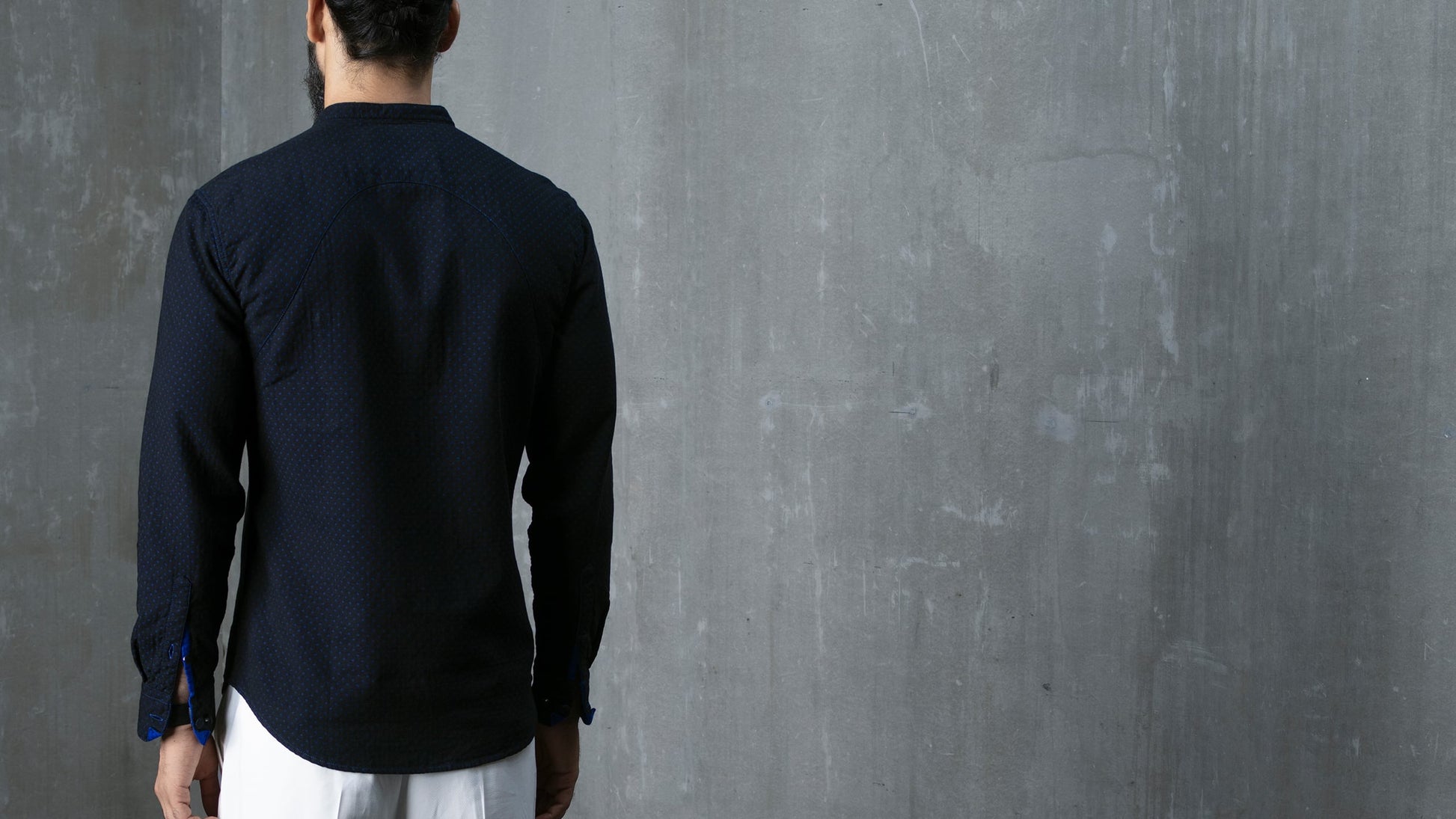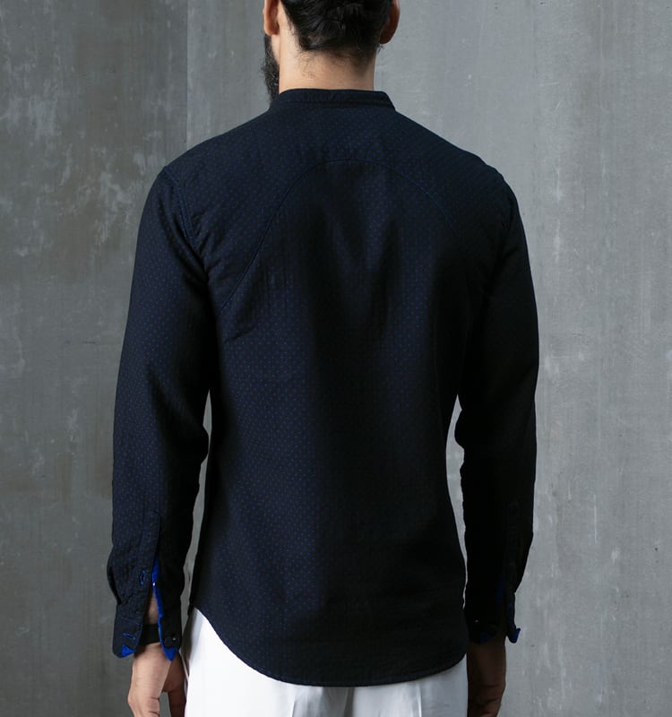 The fourth in the series of 'Sexy Saddy', one of our most iconic silhouettes, in a unique colour combination. This one is made in a double cloth with a beautiful balance between a black and an electric blue. Works particularly well for rolling up your sleeves, or leaving your buttons open - you won't see a faded reverse, instead, a pop of blue will show through and add a lot of character to the look.
