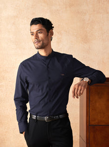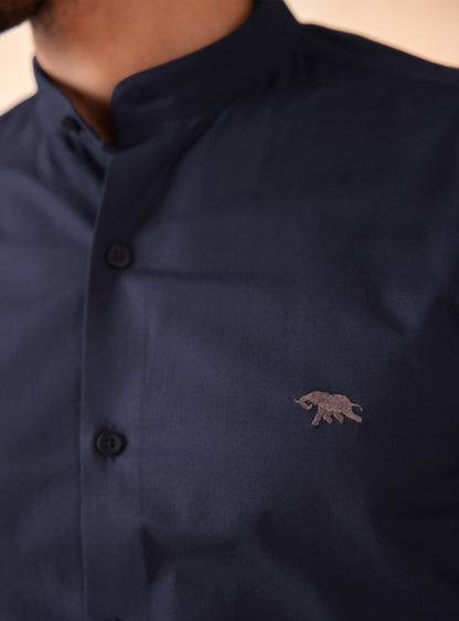 Presenting a timeless evening shirt, in a classic navy color. Made from a rich Indian cotton, in an oxford weave that adds sharpness & depth to the fabric. Features a mandarin collar & Rajan, the mark of Andamen.