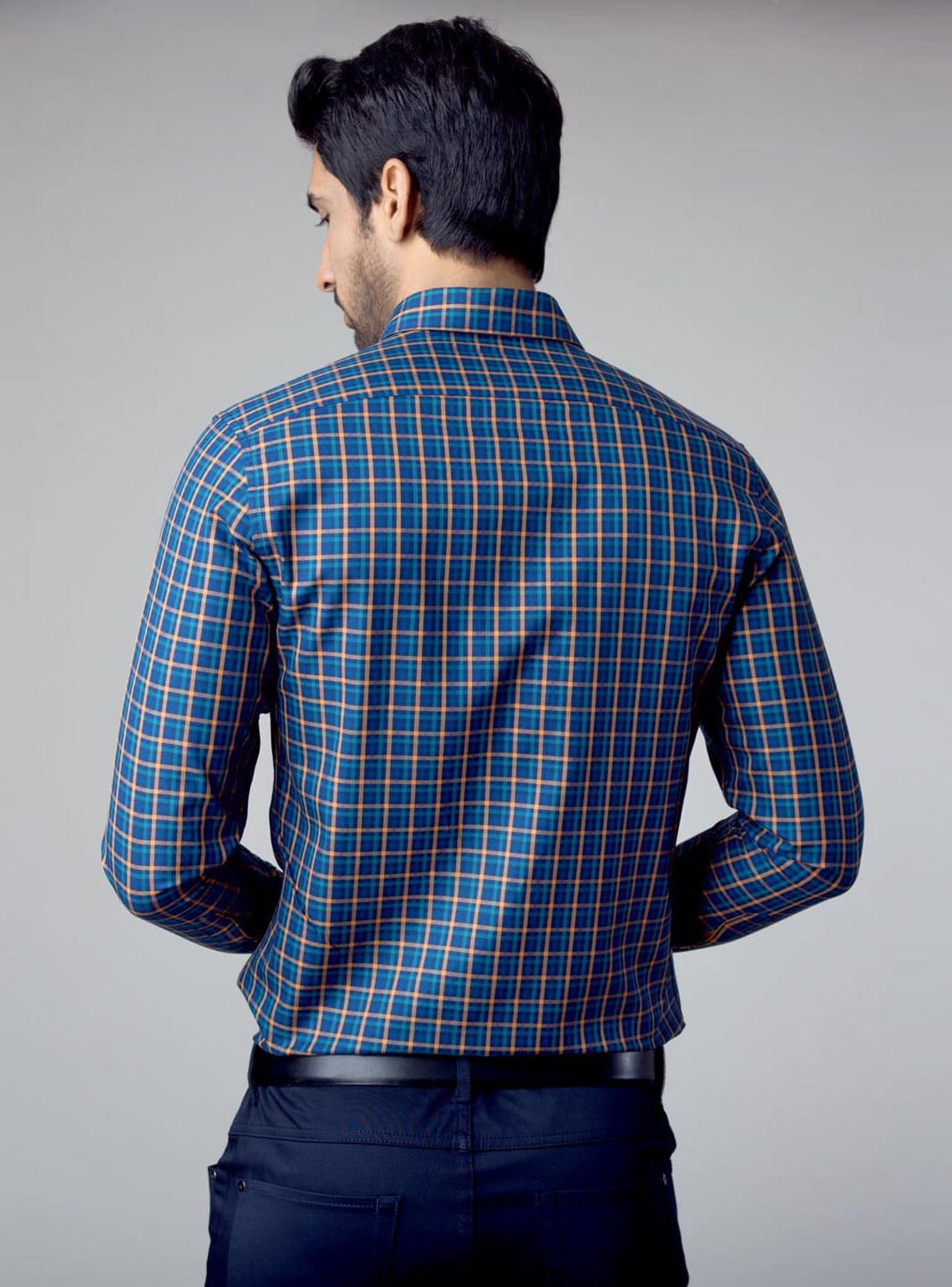 A rule of thumb is that when patterns are involved in a shirt, one should pair it with a plain, or solid suit or pants. Though we normally experiment with most such rules, for best results in a vibrant check like this one, we say – stay classic. Pairs best with a navy jacket and navy pants. For an extra punch, style it with an orange pocket-square.