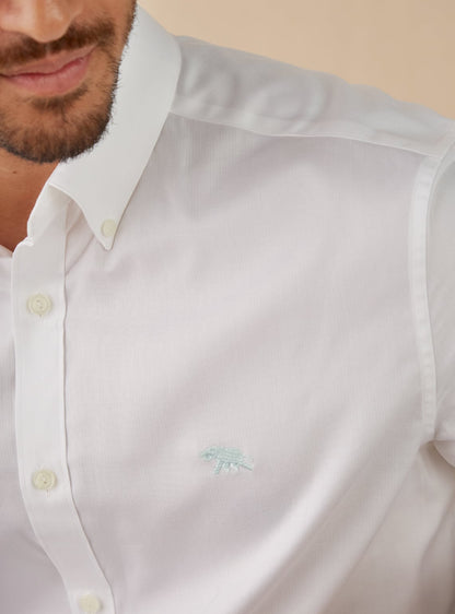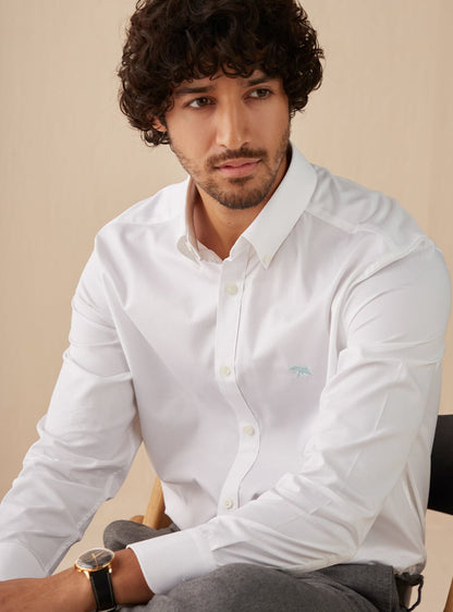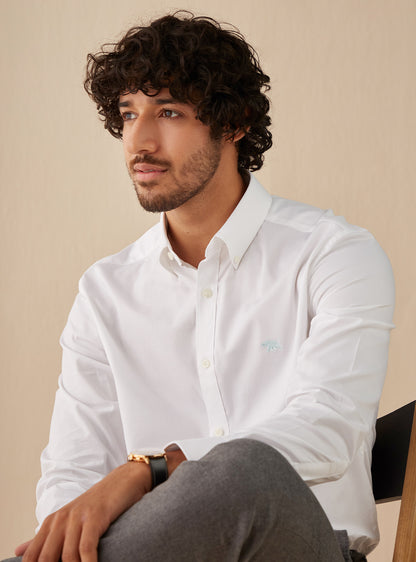 Presenting a timeless evening shirt, in a classic white color. Made from a rich Indian cotton, in an oxford weave. The oxford weave pattern enhances the comfort & durability of the garment. Features an extra long point button-down collar & Rajan, the mark of Andamen.