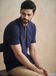 - Contrast tipping detail at collar, contrast piping at side seems.