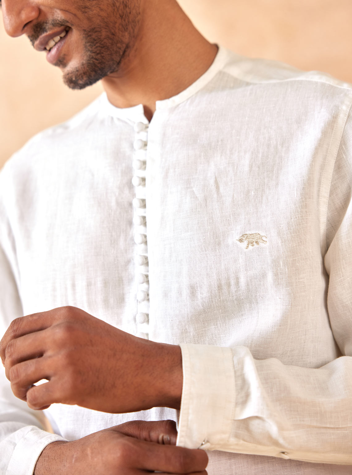 Enjoy the beautifully evolved texture and aesthetic of this popover, crafted from one of Earth's friendliest fibers, Belgian linen. Linen from Belgian flax is softer and more durable. This style is gorgeously coloured and also features handcrafted potli buttons for a true heritage look. It ages beautifully with you, becoming softer with each wash. Also features the mark of Andamen, Rajan the swimming elephant.