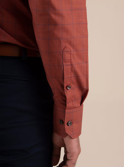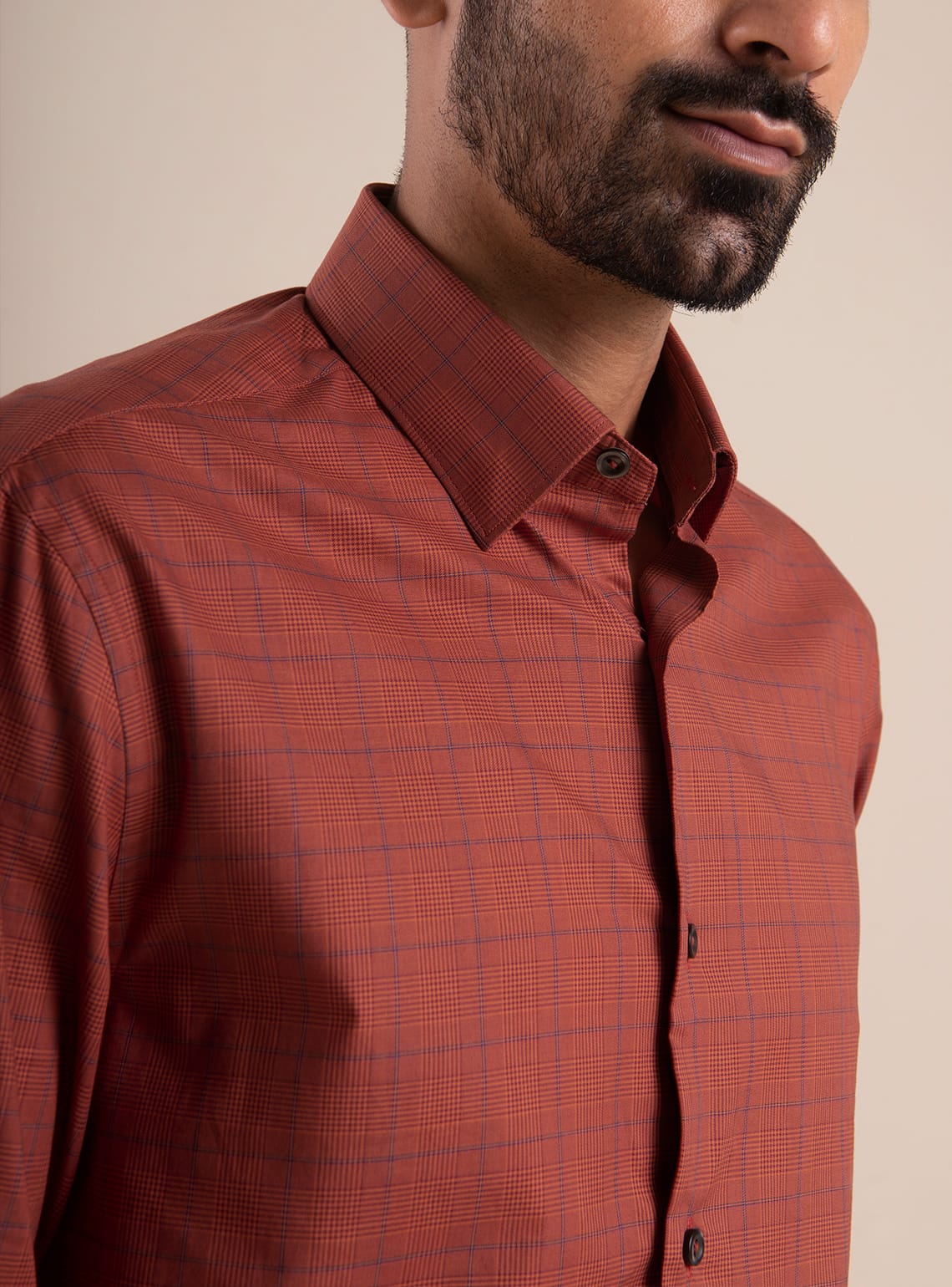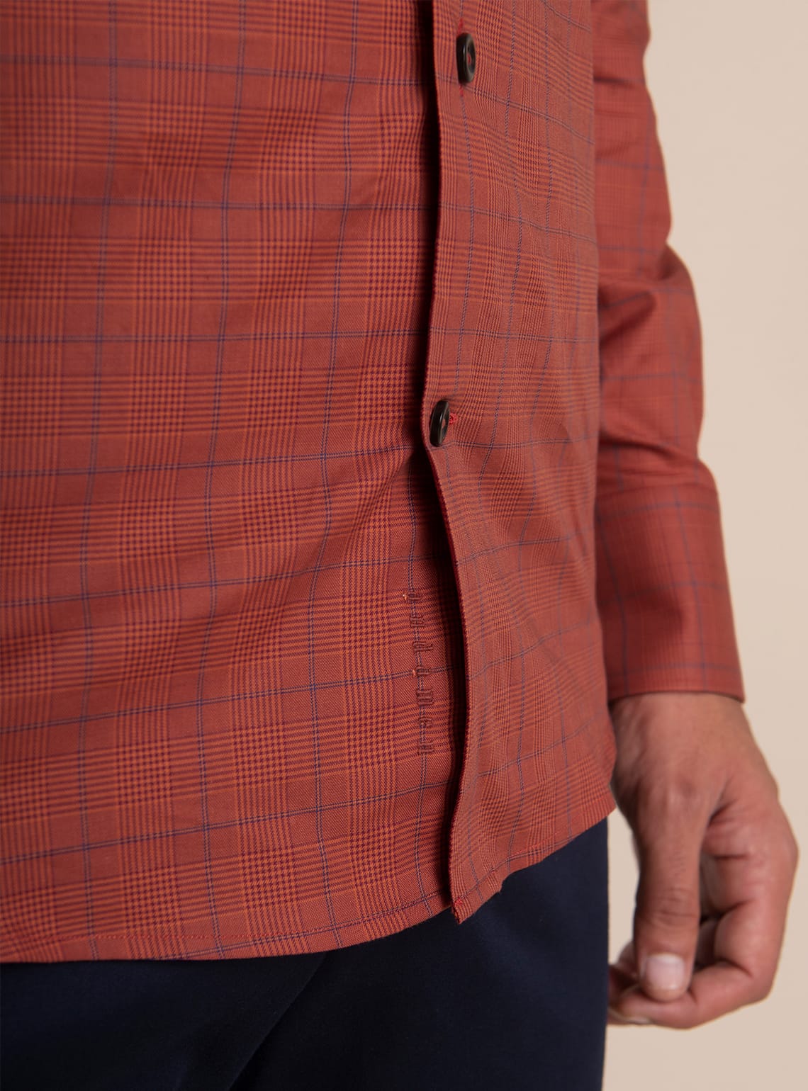 Close your eyes & pick this shirt for any evening you have to go out for. It has a beautiful rust & navy palette which works well for special ocassions & festivals. Features a concealed button-down collar & insignia embroidery on cuffs. The look is sharp, young & understated. It has the perfect balance of a wearable classic just standing out. Part of Andamen's 'Air Twill 95' range of shirts.
