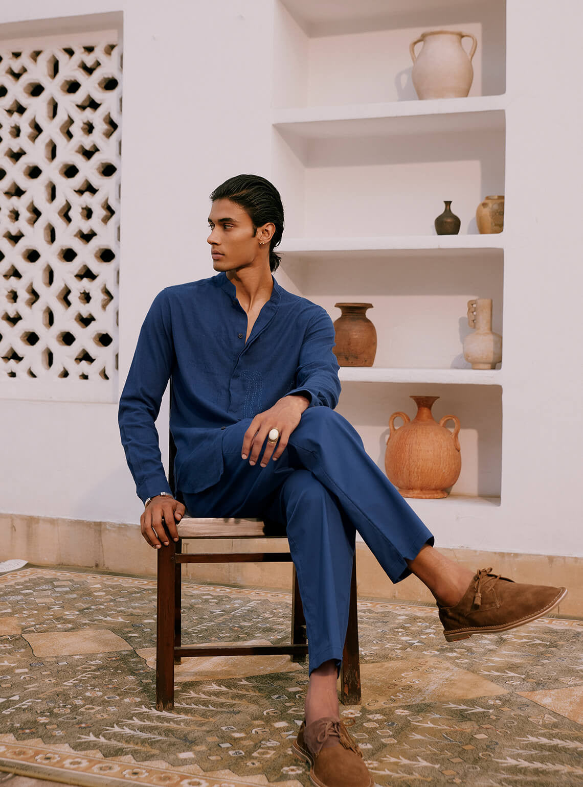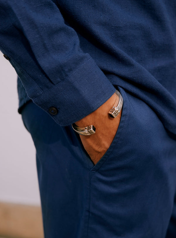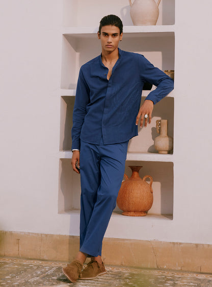 Introducing the Saagar Cotton trouser, a contemporary style rooted in Indian heritage.In a classic blue hue, these trousers feature an easy button closure, pocket play and a half-elasticated waistband, offering a structured yet comfortable silhouette. Essential for blending traditional silhouettes with modern sensibilities, pair them effortlessly with contrasting or matching kurtas, popovers, or shirts to evoke a timeless charm. Ideal for versatile styling from celebratory outings to relaxed gatherings. Built on a legacy of excellence, each hand-crafted piece features minor variations in shade and texture, making it truly one-of-a-kind.Part of the MIRAI collection, where contemporary styling meets heritage fashion.