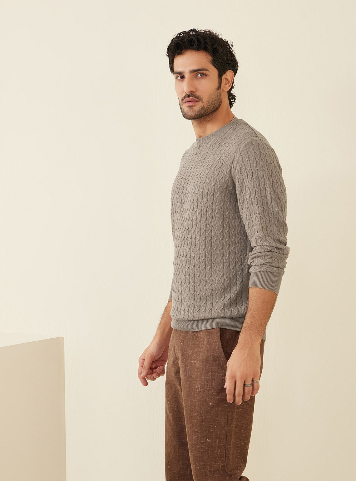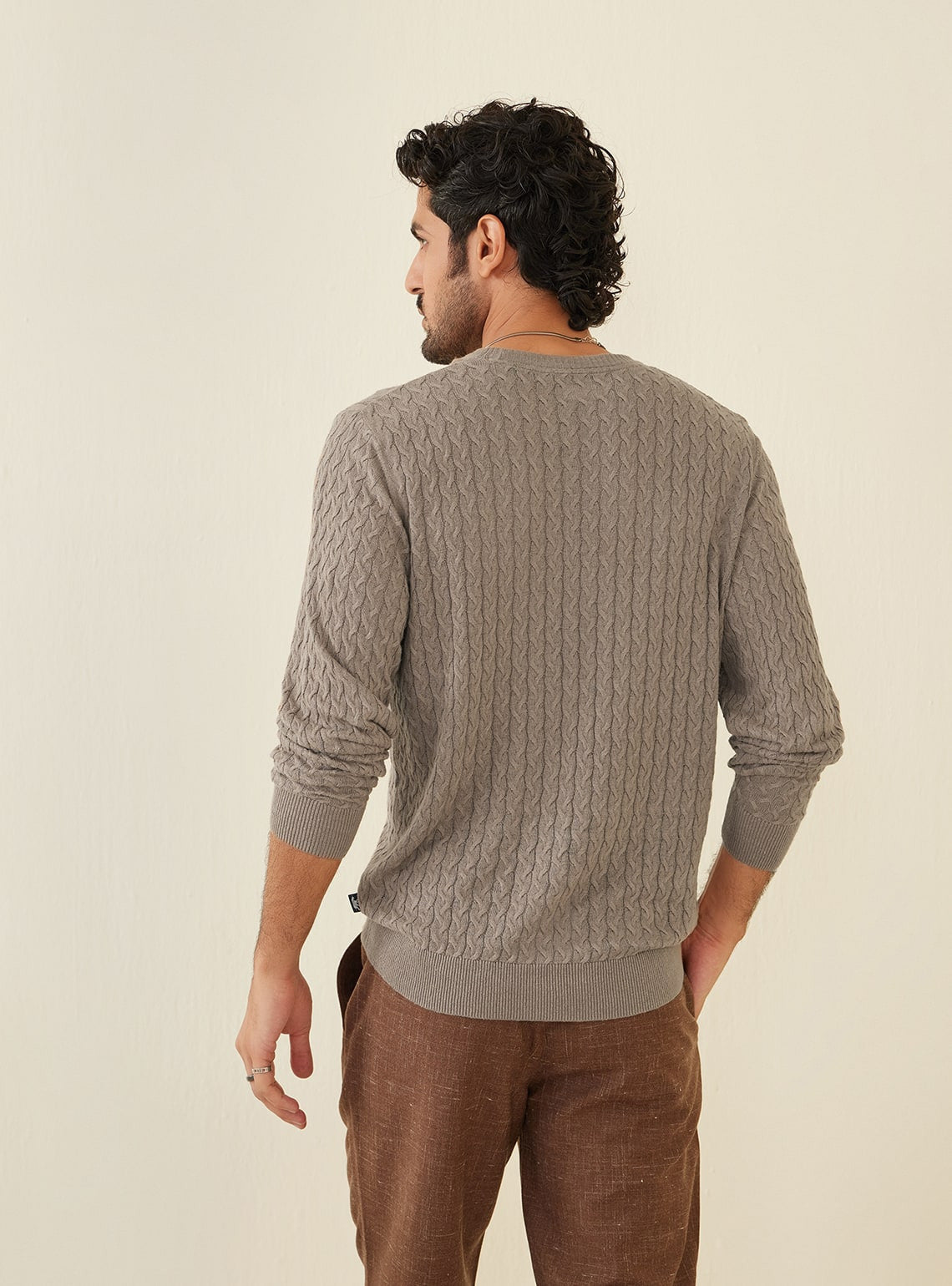 Experience a cable-knit pullover that seamlessly blends the natural elegance of linen with the softness and drape of viscose.