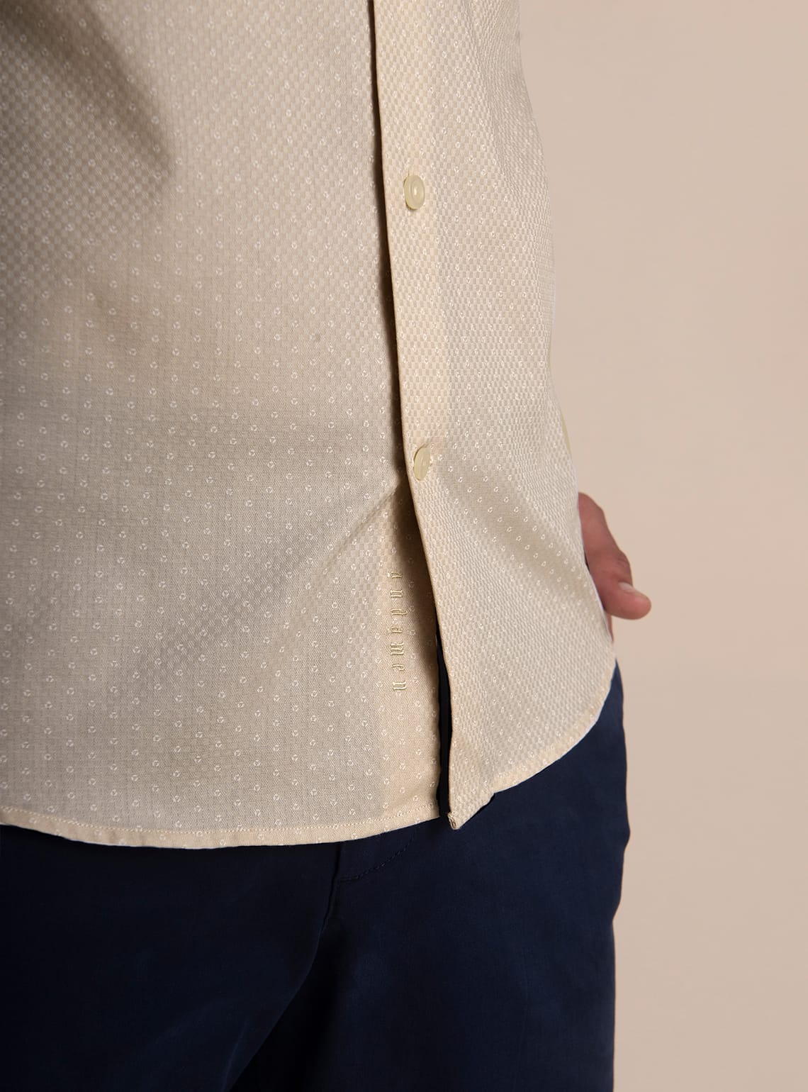 Presenting a timeless evening occasion shirt, in a beautiful khaki color. Made from a rich Indian cotton in a textural dobby weave that adds sharpness and depth to the fabric. Features a cutaway collar along with our insignia embroidery on cuffs.
