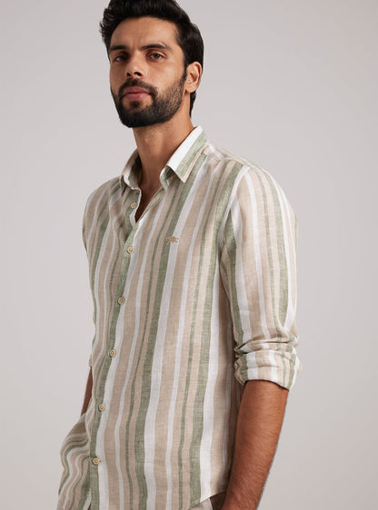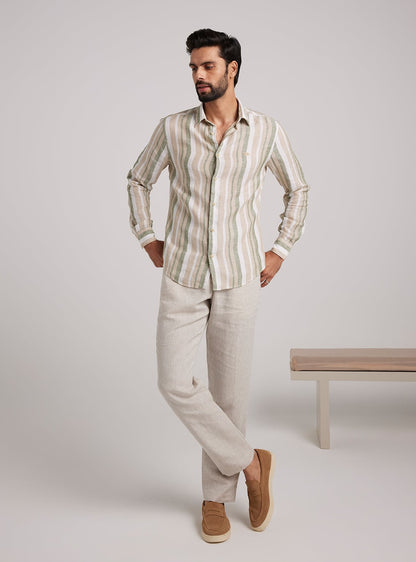 Presenting a shirt that's good on you, & our planet. Crafted from one of Earth's friendliest fibres, European linen, which comes from Belgian flax, a supercrop that requires zero manual irrigation, is 100% bio-degradable & enriches the soil as it grows. Lightweight, naturally breathable & cool to touch, this timeless shirt is softer & more durable than regular linen. Features a small-point collar, & bold stripes.