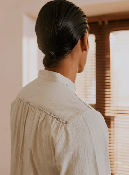 Presenting the Sneh Khadi Shirt, a contemporary style rooted in Indian heritage.Crafted from 100% handspun cotton by skilled artisans, this off-white full-sleeve shirt features elegant potli buttons and refined piped detailing, adding just the right amount of traditional touch. With its softness elevated to an art and eco-friendly dyes, this garment offers a unique texture that caresses the skin, ensuring a super comfortable wear.Pair this versatile silhouette with linen pants to tie the look together, creating an elevated and elegant ensemble.Built on a legacy of excellence, each hand-crafted piece features minor variations in shade and texture, making it truly one-of-a-kind.Part of the MIRAI collection, where contemporary styling meets heritage fashion.