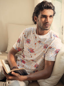 An uplifting summer floral. Soulful, breezy, joyous. Made from 100% Supima cotton - a better, superior cotton known for durability and softness. Precisely spun into a 24s single jersey fabric for the right balance between breathability and lightness. Designed to be worn individually, or under our earthy linen shirts.