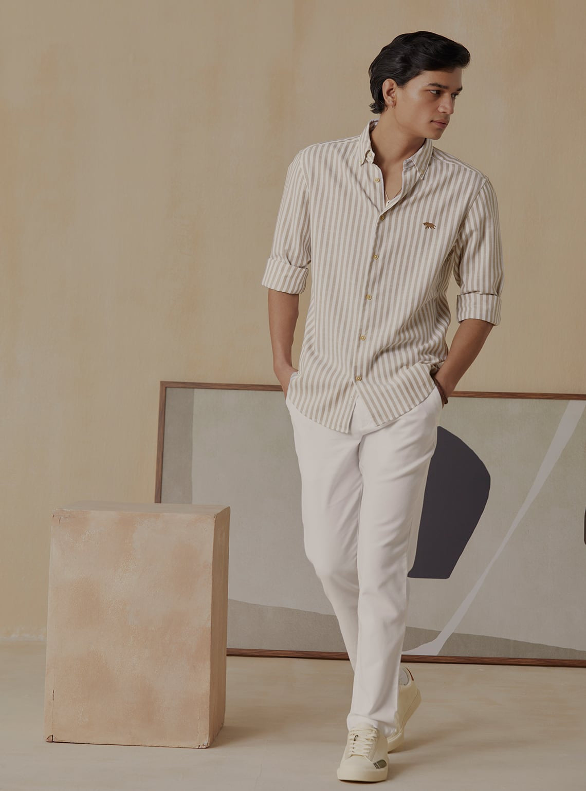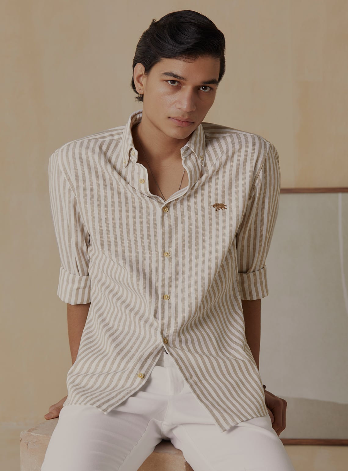 This shirt is meticulously crafted from cotton in a dobby weave, ensuring comfort and breathability. Designed in a full-sleeve silhouette, it not only provides sophistication but also features stripes, & Rajan, the mark of Andamen.