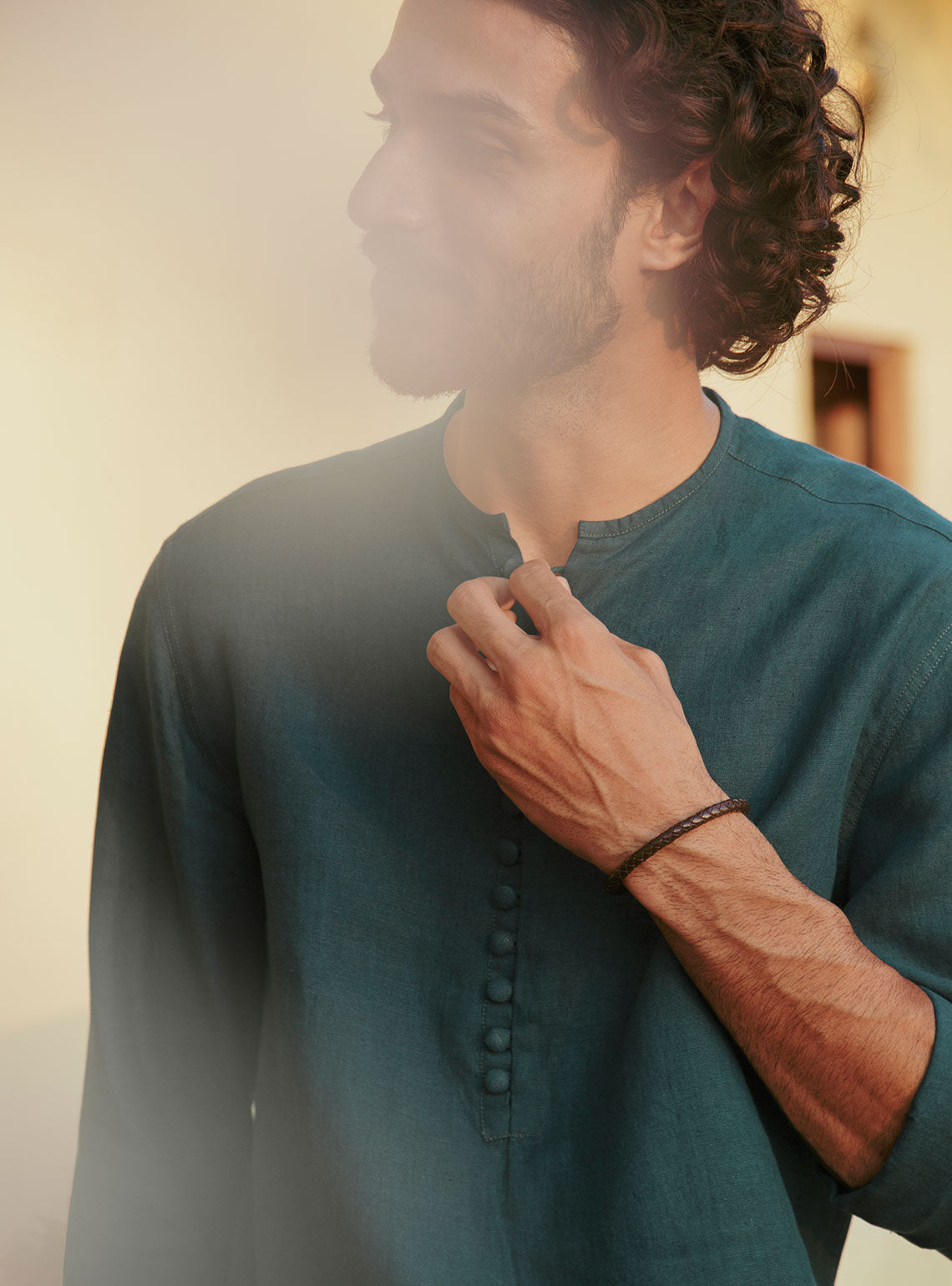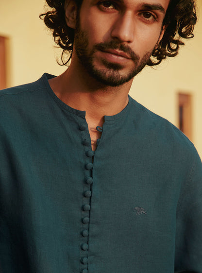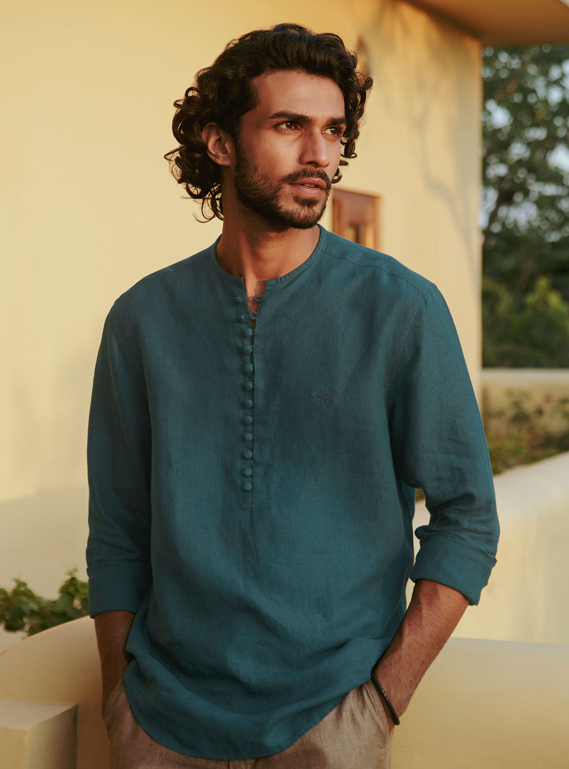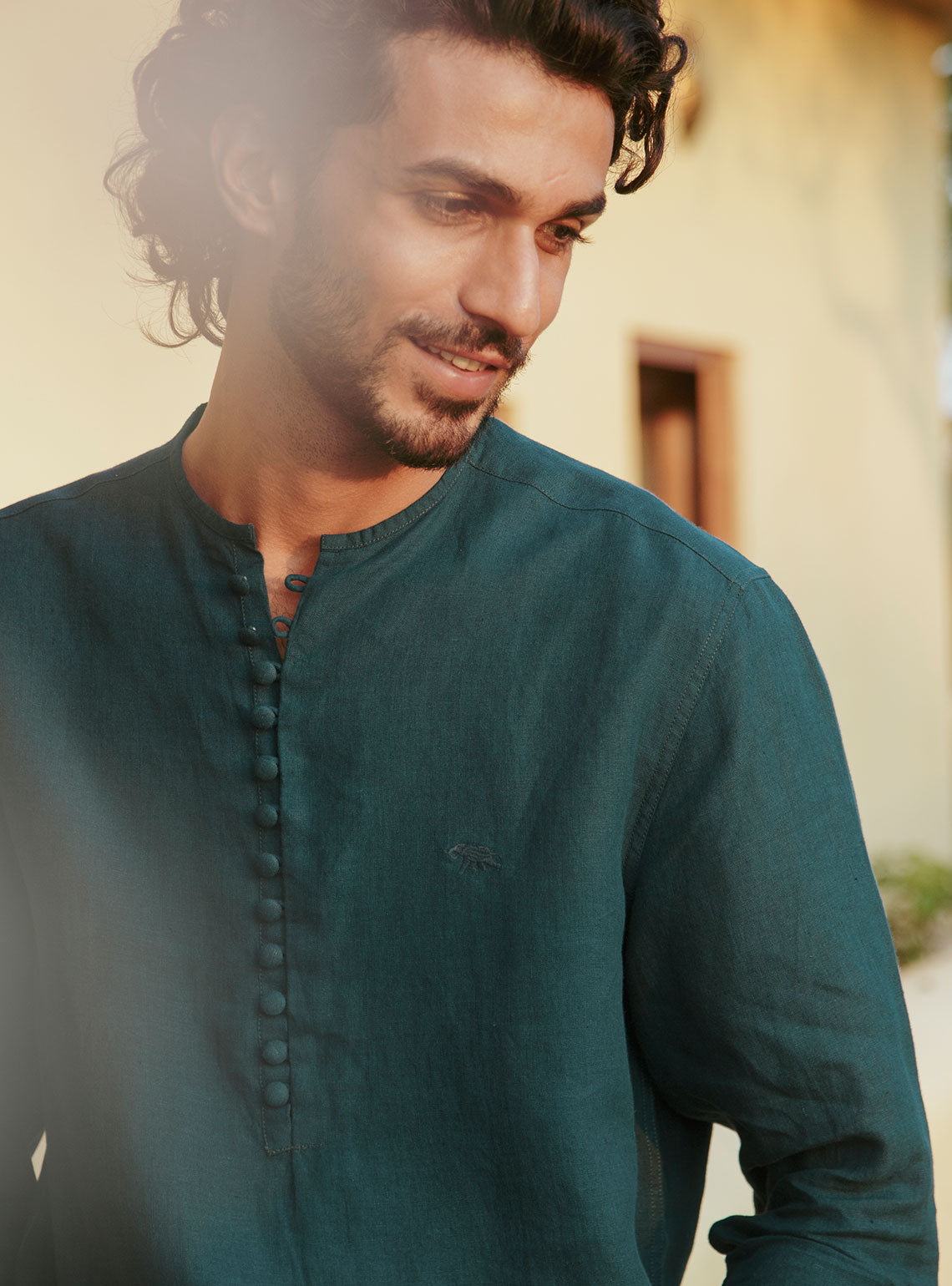 Enjoy the beautiful aesthetic of this popover, crafted from one of Earth's friendliest fibers, Belgian linen. Linen from Belgian flax is softer and more durable. This style is gorgeously coloured and also features handcrafted potli buttons for a true heritage look. It ages beautifully with you, becoming softer with each wash. Also features the mark of Andamen, Rajan the swimming elephant.