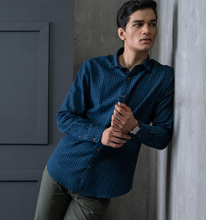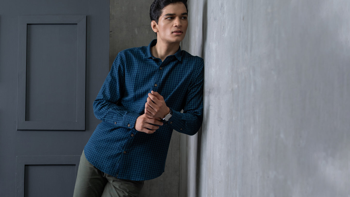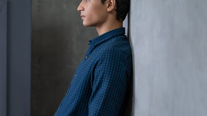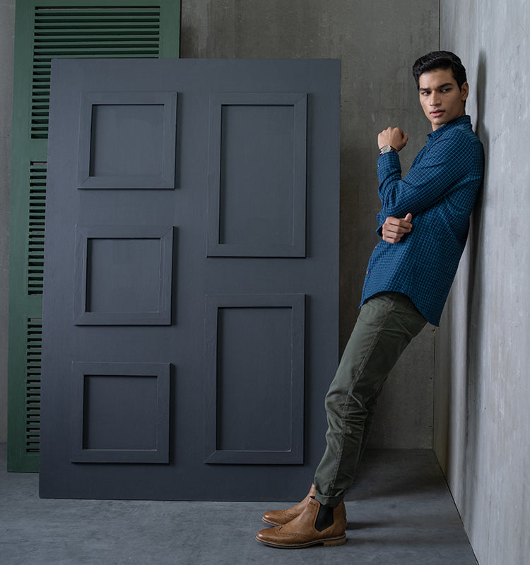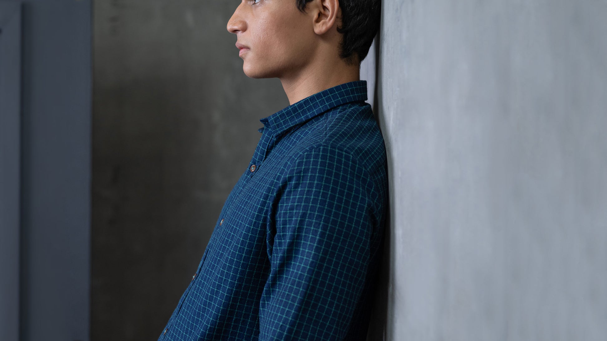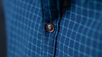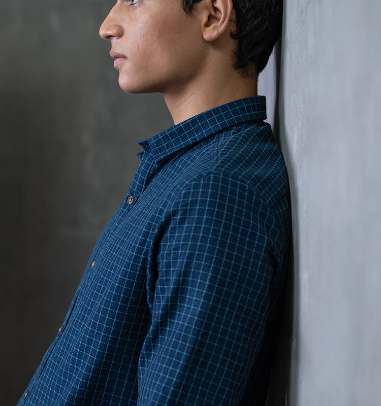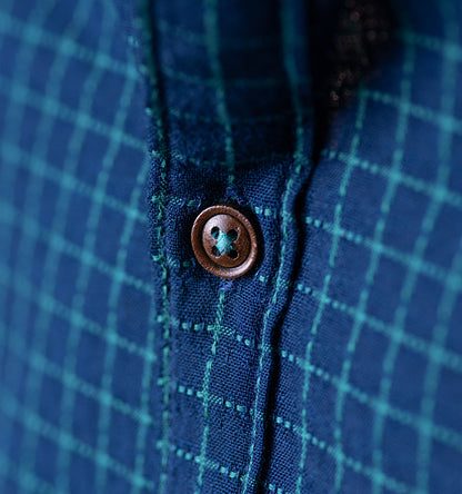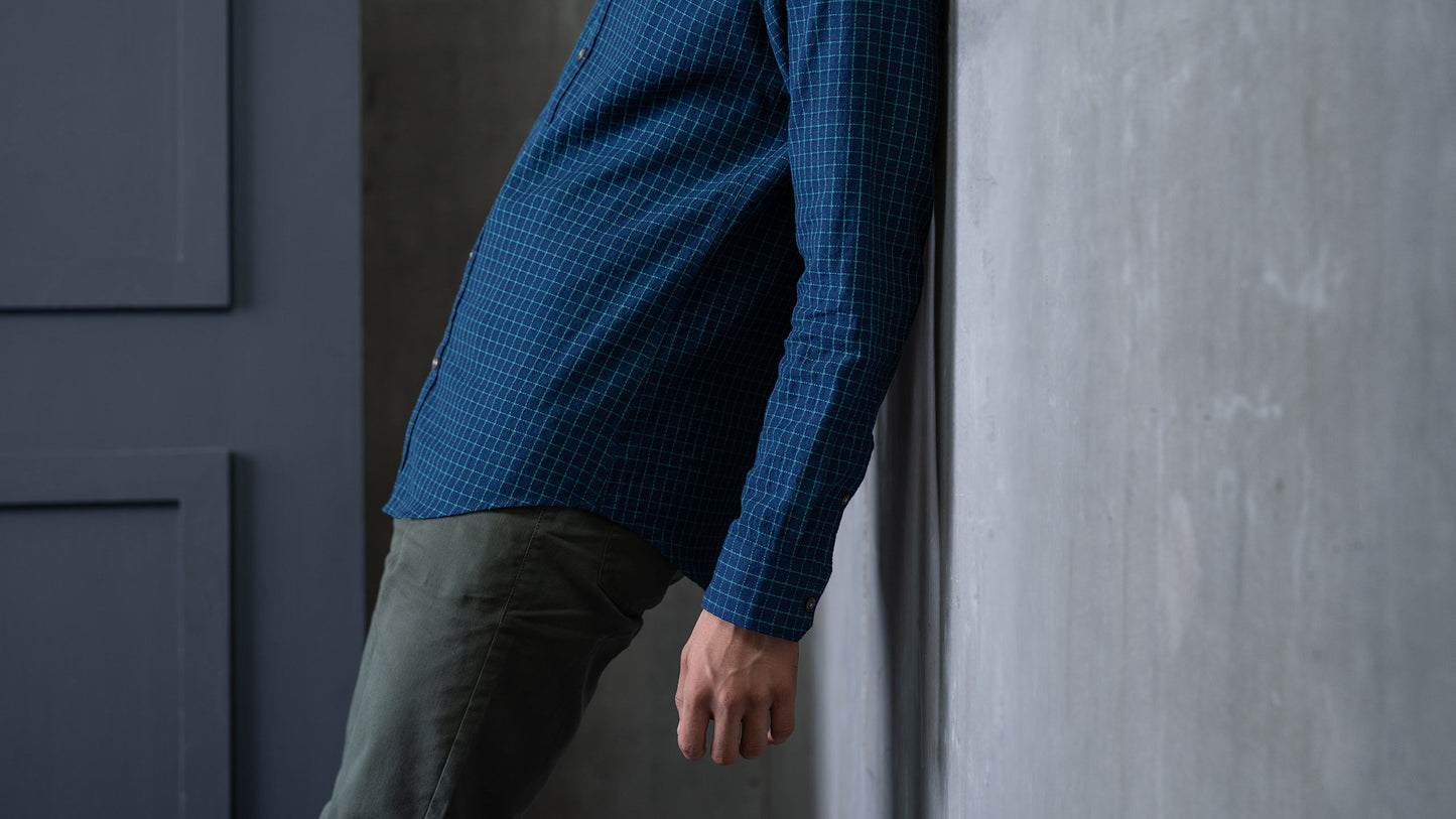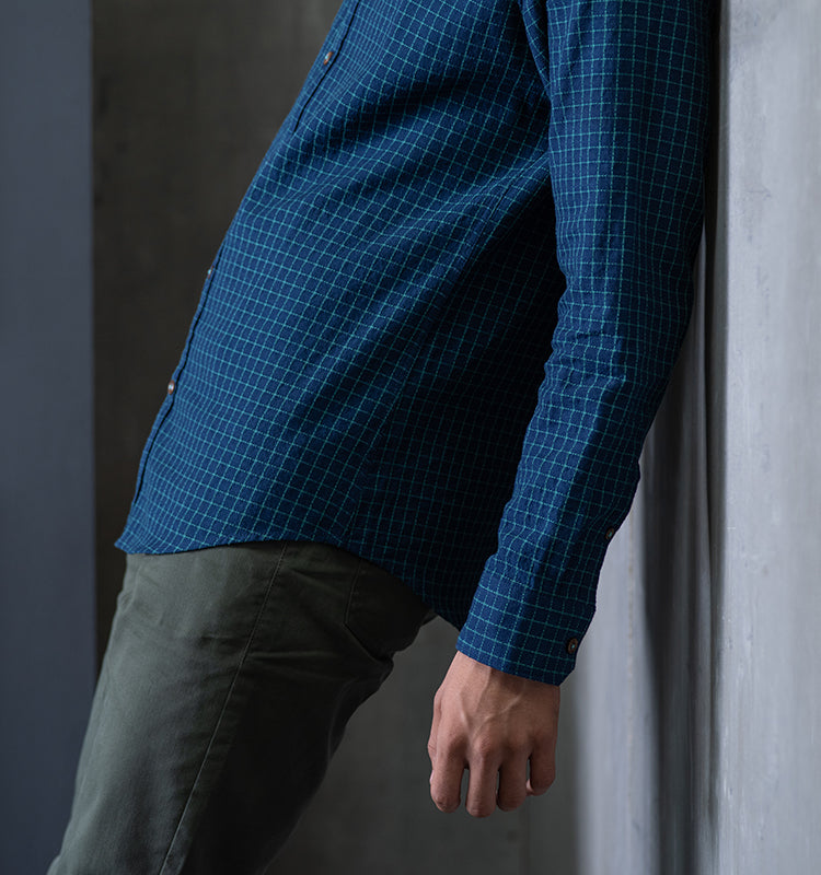 A raw indigo with a Neo-futuristic check. If you like travelling, this shirt is made for you. It's a mid-weight loose weave that works through the year. Looks great when worn individually and also works as a layering piece. We suggest pairing it with Andamen chinos.