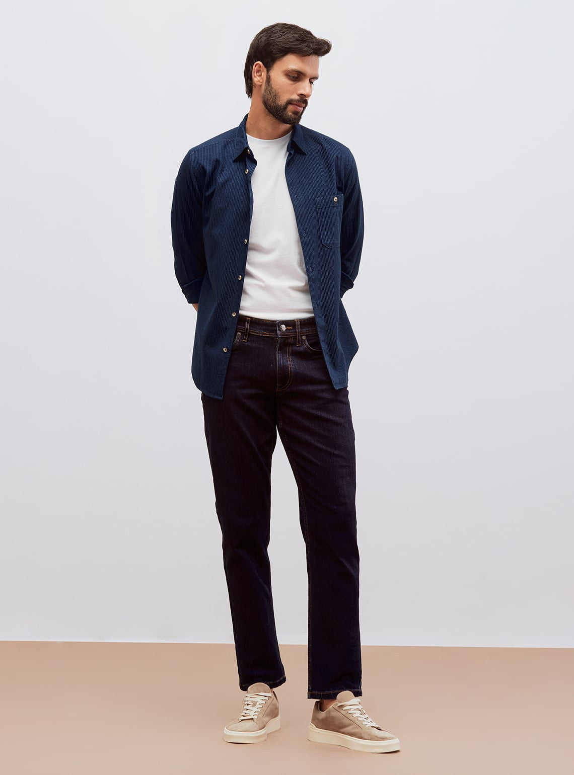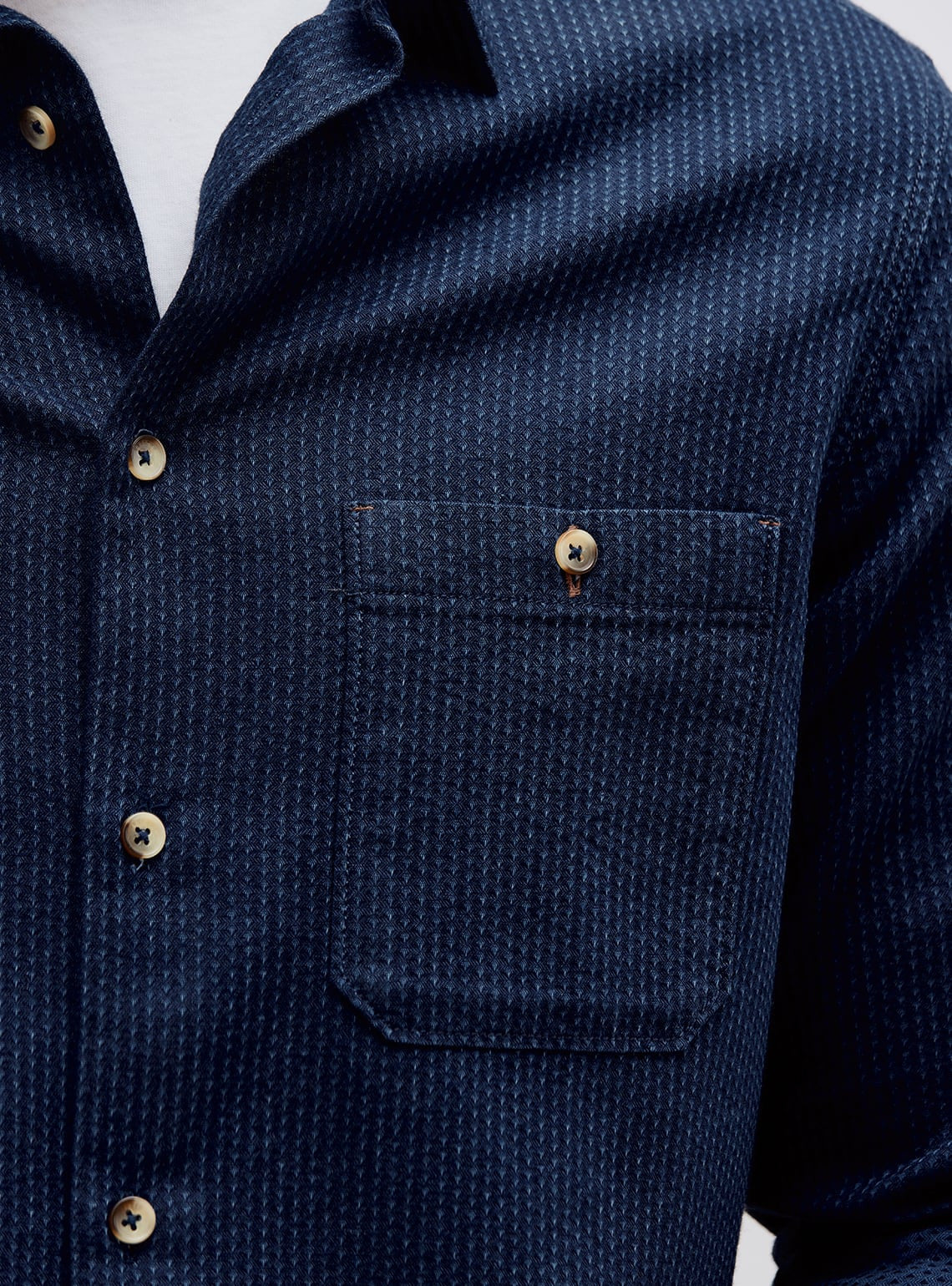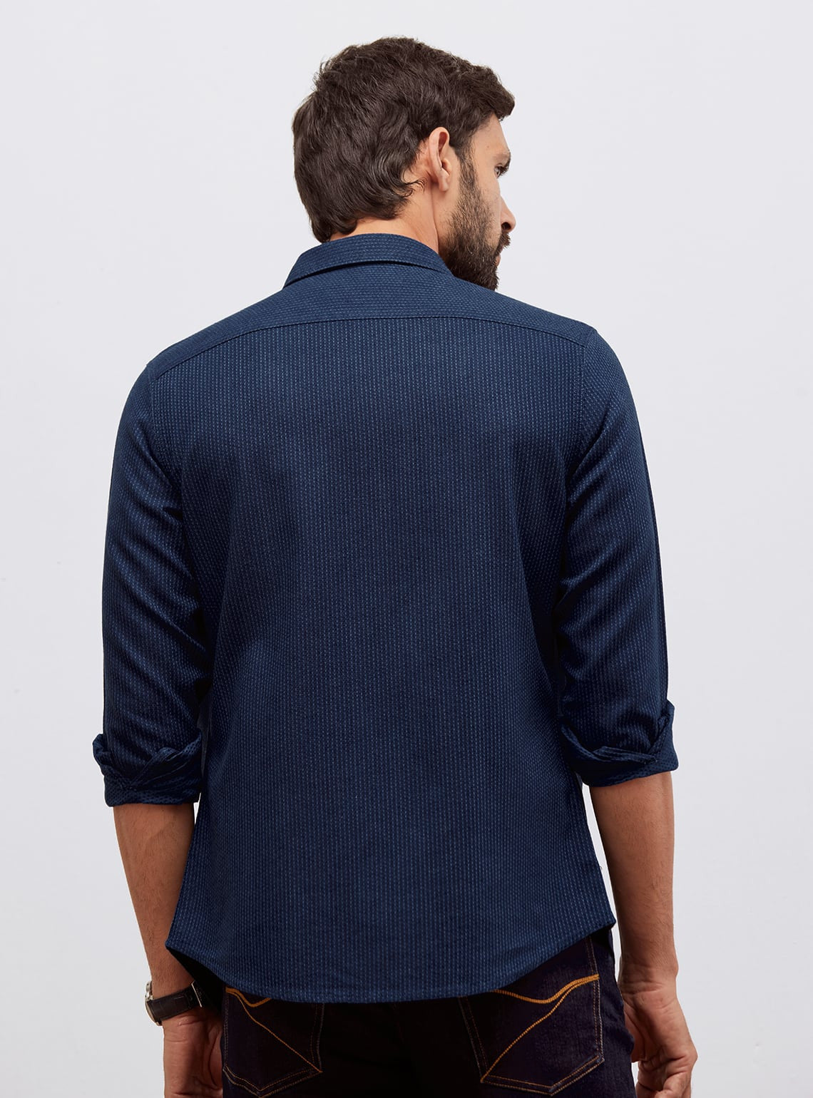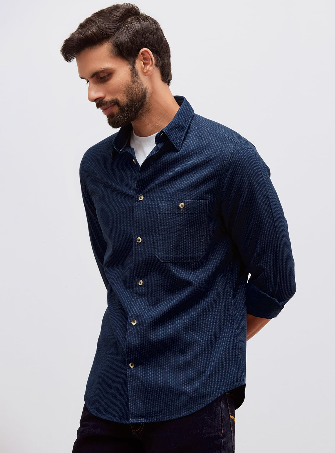 Presenting a timeless Indigo shirt, expertly woven from rich Indian cotton in a classic dobby weave, ensuring durability & comfort.